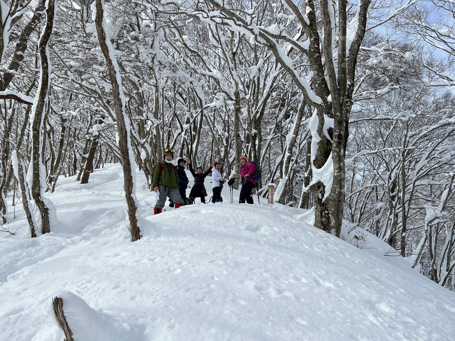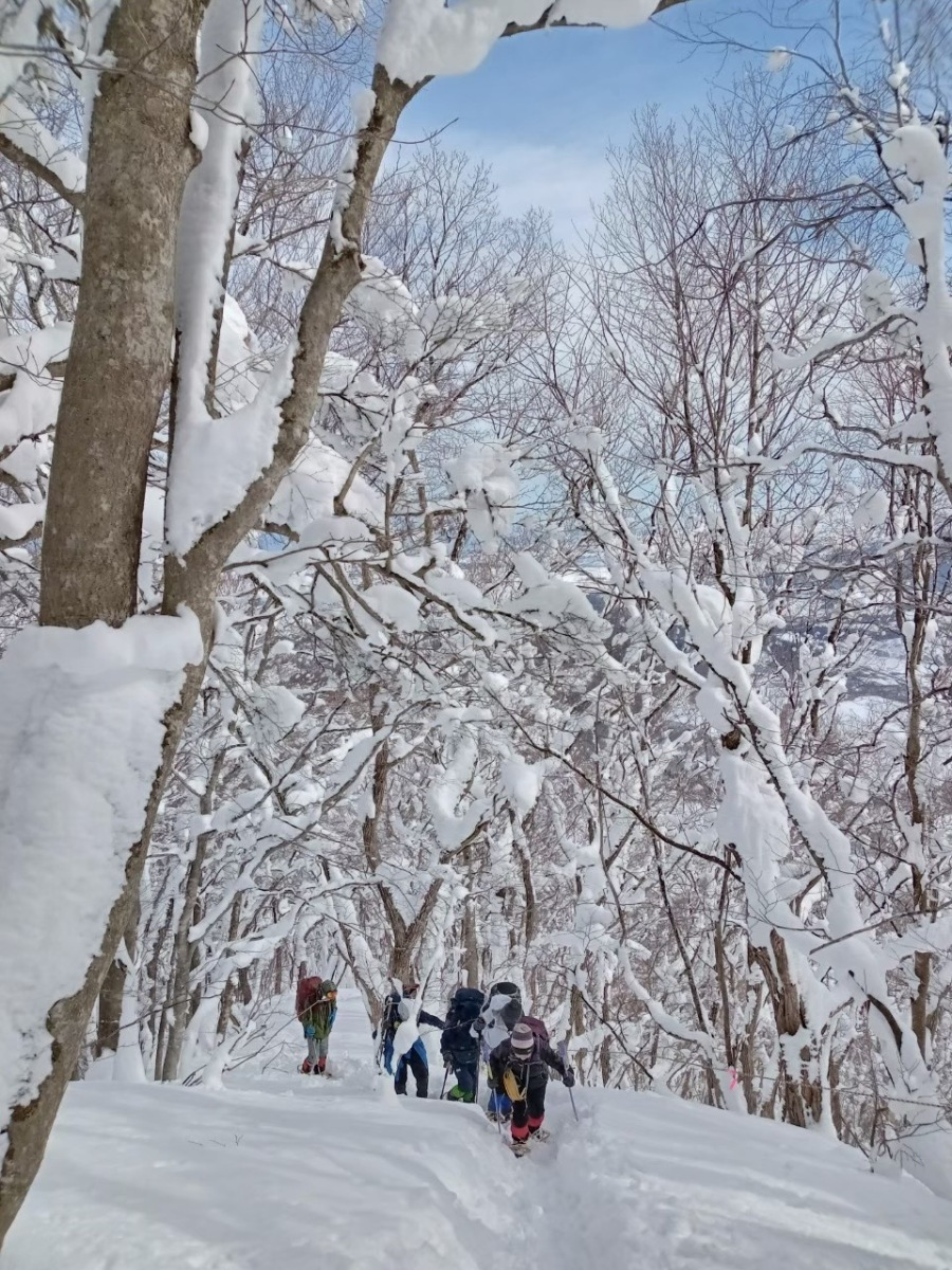 今日は快晴無風、最高のお天気でした。やくらいスキー場は大賑わい。薬萊山は登りも下りも急登続きです。50センチ以上の深雪です。つぼ足から途中、カンジキをはいて。既に踏み跡のトレースをあるもののわざと深雪を歩いたり大汗をかきながら頂上を目指して。皆さん素晴らしい雪景色に感嘆しながら順調に頂上に。昼食後、帰路は周回コースをとりました。 急坂をオシリ滑りしたりしながらリズム良くスキー場まで一気に時間通りに下山しました。本当にお天気に恵まれ楽しい山行でした。雪山歩きがまた、やみつきになりそうです。お疲れ様でした。