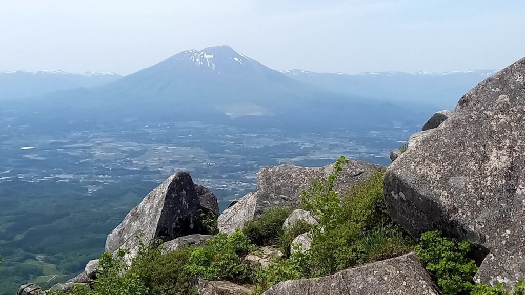360度パノラマの山頂は多くの人でいっぱいだ。 ここで思い思いの場所でランチとコーヒータイム。西に岩手山や八幡平、焼石岳、和賀岳、東に早池峰山が見渡せた。 少し風はあるものの快適な時間を過ごした。