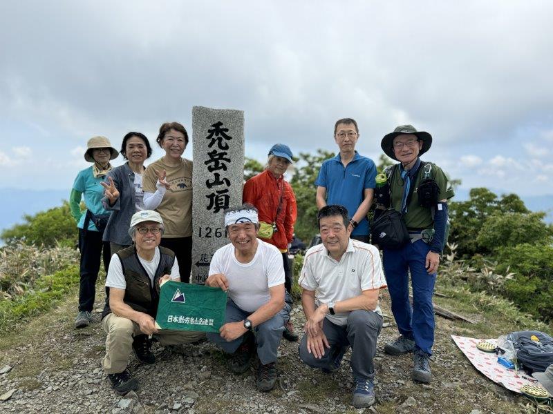 花立峠の車道から少し登ったところにあるデナリ遭難者の慰霊碑を訪れ、全員で黙とうを捧げました。天気予報通り、曇り時々薄日が差す中、登山を開始しました。
