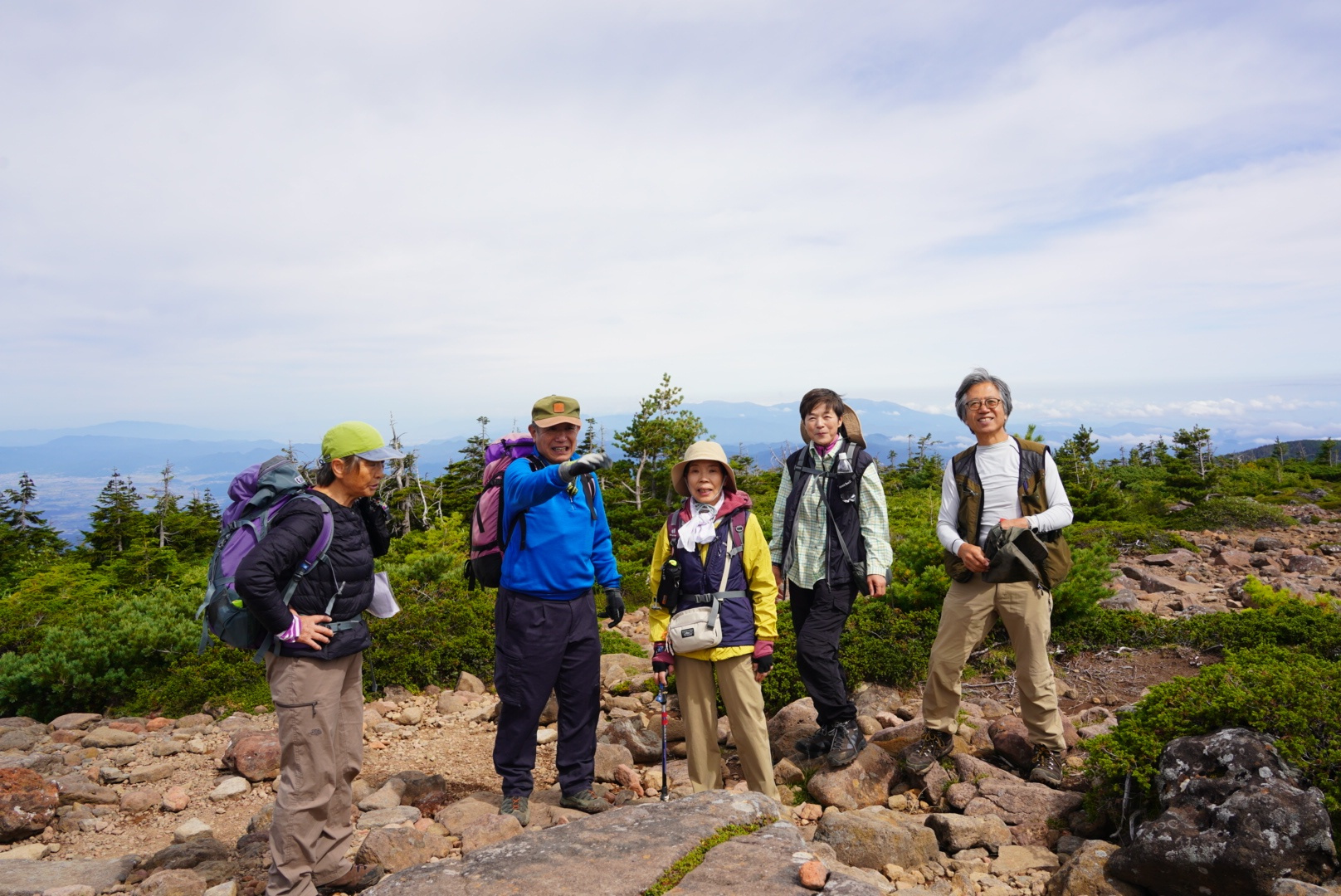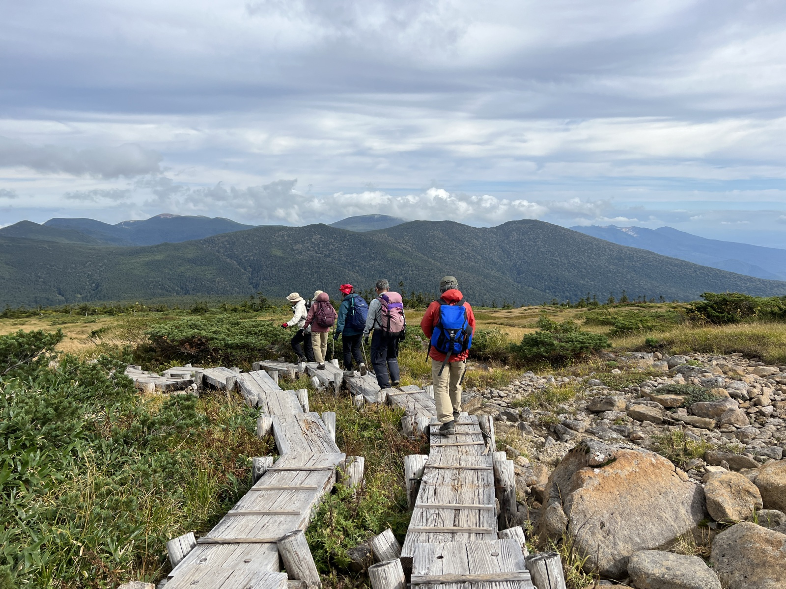 当日は遠くまで見通しのきく天気に恵まれ、朝日、飯豊山、蔵王連峰、そして遠くに見える鳥海山など、壮大な景色を眺めながら、のんびりと歩みを進めました。途中、数度の短い休憩を取りながら、山頂付近に広がる池塘や天狗岩など写真撮影を楽しみ、時間はゆっくりと過ぎていきました。