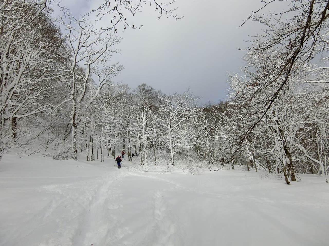時より雪も降るものの樹林帯は風も無く途中からは青空にもなり昨夜からの寒波でブナの森は美しい雪化粧になりとても感動しました。
