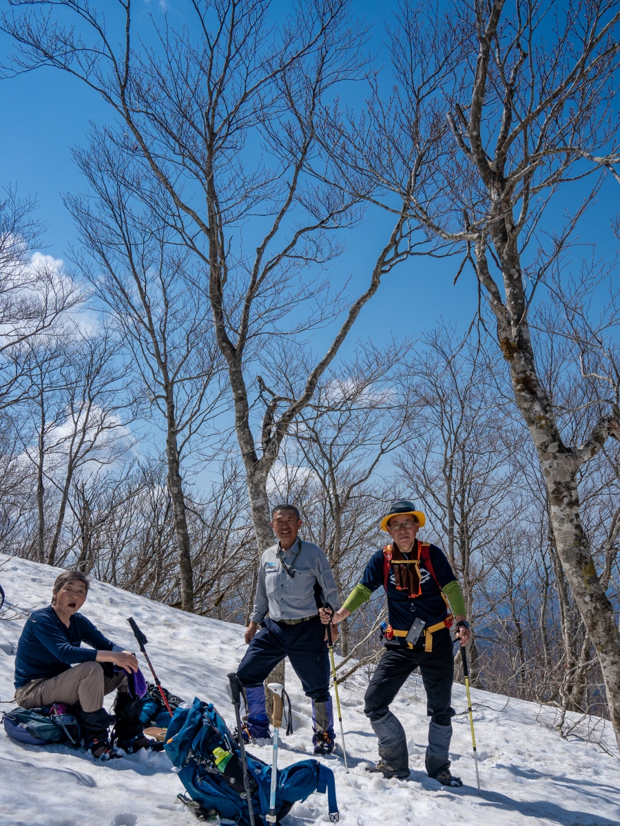残雪の北面白山 クラブ山行 2024.04.13 天童高原からの北面白山は、一昨年の秋以来2度目。 たまたま快晴の日にあたり、気温も上昇して5月下旬並みとの予報であった。 仲間4人で春の日差しをたっぷり浴びて、楽しい1日を過ごしました。 天童高原スキー場駐車場は土曜日にもかかわらず3台の車があるだけでした。 登山者も少なく、静かな山を楽しむことができた。