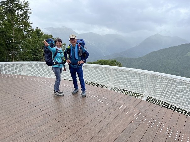 1日目の目標は、西穂山荘のテント場での宿泊。料金は一人2,000円だ。西穂山荘に到着すると、驚きの出会いが待っていた。NHKラジオ「やまカフェ」の石丸謙二郎さんが、小屋の粟沢支配人と話をしていたのだ。機会を逃すまいと、話しかけると、石丸さんは気さくに応じ、ツーショットの写真までOKしてくれた。